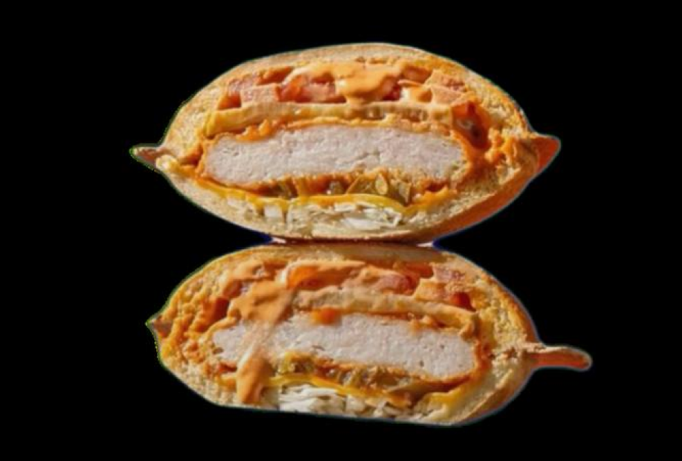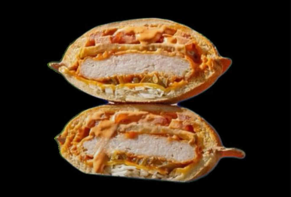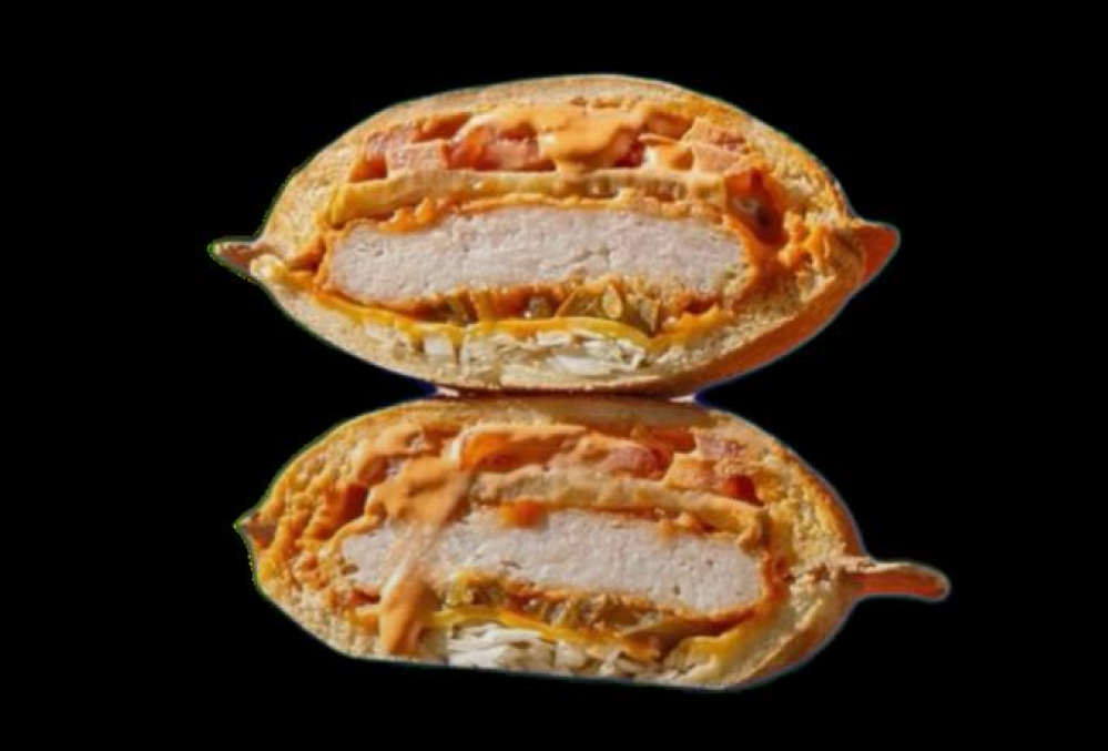 Соус Сырный, лист салата Айсберг, томат, огурец маринованный, филе куриное Панко, сыр Чеддер, соус Спайси